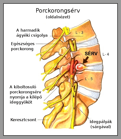 • porckorong degeneráció, porckorong sérv: a csigolyák között rugalmas porckorongok helyezkednek el. Ezek a porckorongok a szervezet öregedésével veszítenek rugalmasságukból, ellapulnak. Tartós egyirányú megterhelés vagy egy hirtelen mozdulat hatására kiboltosulhatnak, nyomást gyakorolhatnak a gerincvőből kilépő ideggyökökre. A kiboltosulást gerincsérvnek nevezzük. Ha a sérv az ideggyökre is nyomást gyakorol, az alsó végtagban kisugárzó fájdalom, izomgyengeség, érzészavar( zsibbadás, bizsergés) vagy érzéketlenség jelentkezhet.