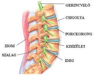 A gerinccsatornában (canalis spinális-ban), csontok által védett helyen fut a gerincvelő. A gerincvelőből két oldalra a csigolyák által alkotott foramenek-en keresztül lépnek ki a spinális, más néven gerincvelői idegek. Az ágyéki szakaszon ezek az ideggyökök lefelé tovább haladnak, perifériás idegekké válnak szét, és beidegzik az alsó végtag izmait, bőrét.